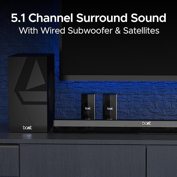- ✅ 5.1 Channel Sound: Step beyond the realms of physical space with 5.1 channel sound. The Home Audio System includes a soundbar with 3 in-built full-range speakers, 2 full-range satellite speakers and an external subwoofer for utmost aural clarity. Enjoy the clean highs, great mid and crisp lows. Bring home your personal home theatre 5.1 channel with bluetooth & bass. The subwoofer and the satellite speakers are wired.